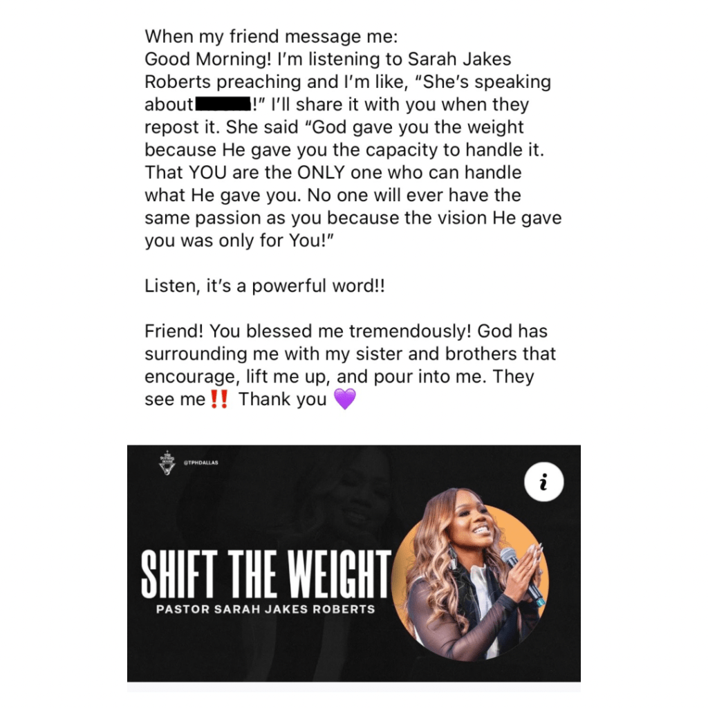 Yesterday, I texted a friend during Sunday morning service to let her know the message Pastor Sarah Jakes Roberts was preaching was about her. I’ve never really spoken to her about anything spiritual before other than saying, “I’m praying for you”, “God’s got you!”; you know, that sort of thing, but nothing more. Well, yesterday I heard as clear as day, you need to send her this message. Even after texting her that morning, I was still second guessing if I should send the link that evening. I had imagined she’d forgotten that I said I would. However, I didn’t wait. I was obedient and sent her the link when it was first available.