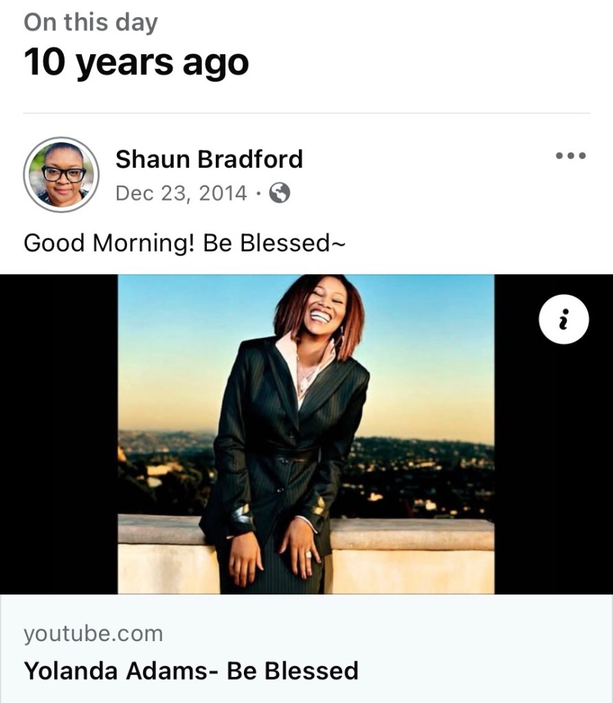 On this day ten years ago (December 23, 2014), I was listening to “Be Blessed” by Yolanda Adams. The song says (which is also my prayer for you)—