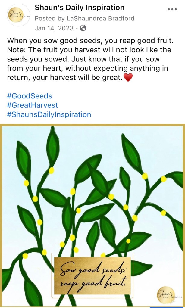 hopeAlways Sow Good Seeds January 14, 2025January 14, 2025 Shaun Bradford Good Morning☀️ Always sow good seeds if you want to reap a good harvest.♥️ Love you, Shaun Share this: Click to share on X (Opens in new window) X Click to share on Facebook (Opens in new window) Facebook Like Loading... Published by Shaun Bradford My life is full of adventures— good and bad, and I’m living in every moment. Can’t help but be present. View all posts by Shaun Bradford