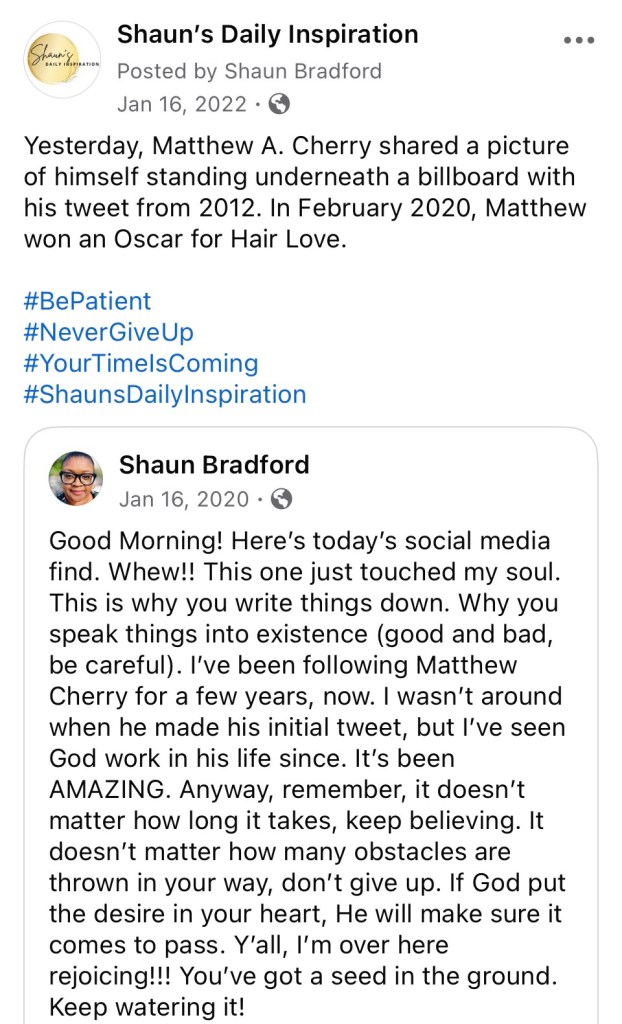 A few years ago, I shared Matthew A. Cherry’s story about his desire to be nominated for an Oscar award. Eight years after he tweeted about it, he was nominated for one and won! Here’s what I shared: