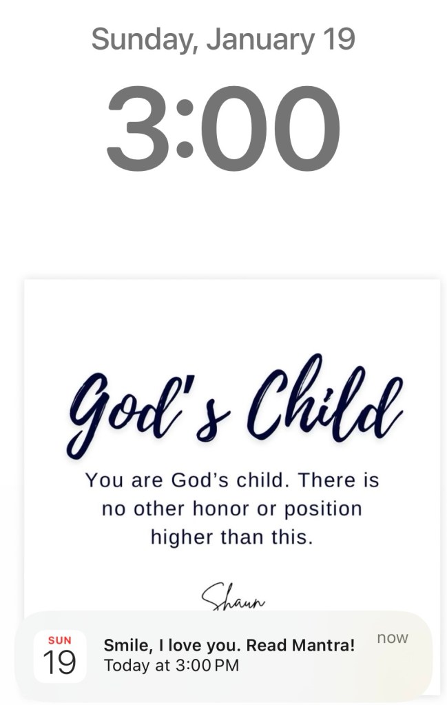 hopeMy Daily Reminder January 19, 2025 Shaun Bradford My daily reminder just popped up. It’s perfectly aligned with today’s mantra—“I am loved.”🥰 I’m also God’s child.🥰 Share this: Click to share on X (Opens in new window) X Click to share on Facebook (Opens in new window) Facebook Like Loading... Published by Shaun Bradford My life is full of adventures— good and bad, and I’m living in every moment. Can’t help but be present. View all posts by Shaun Bradford