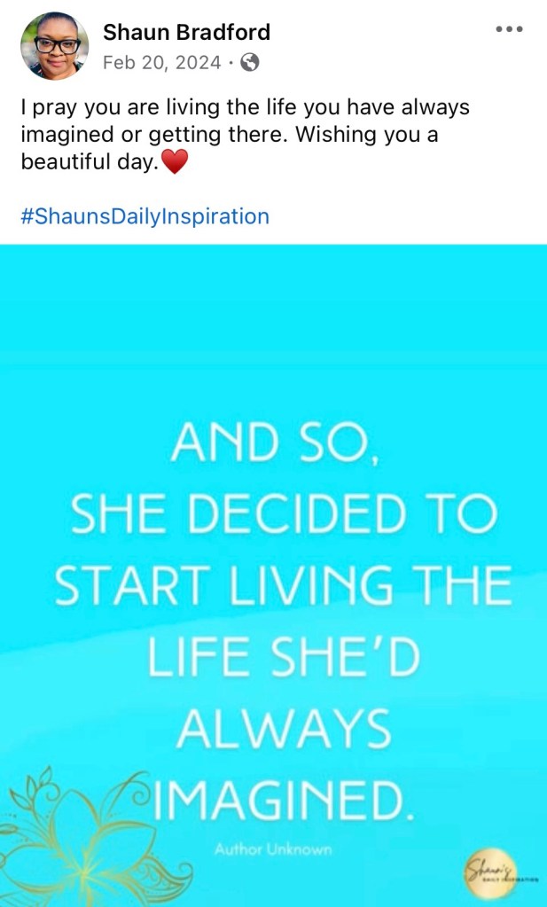 hopeLive February 20, 2025February 20, 2025 Shaun Bradford Live! Live the life you’ve always imagined!♥️ I love you much, Shaun ♥️ Share this: Click to share on X (Opens in new window) X Click to share on Facebook (Opens in new window) Facebook Like Loading... Published by Shaun Bradford My life is full of adventures— good and bad, and I’m living in every moment. Can’t help but be present. View all posts by Shaun Bradford
