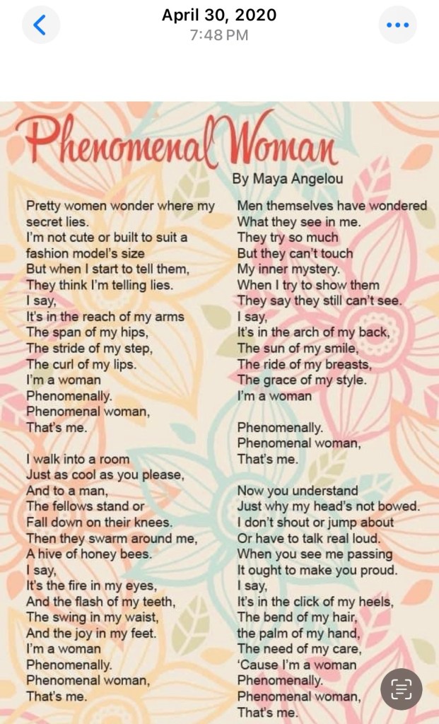 Found this beautiful reminder by Dr. Maya Angelou in my in my saved photos (April 30, 2020). “I’m a woman. Phenomenally. Phenomenal woman, that’s me.”