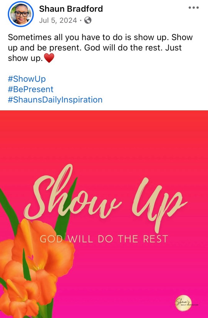 You show up and keep showing up. You show up hurt, disappointed, broken/heartbroken, discouraged, etc. You just keep showing up. Not saying you don’t allow yourself time to feel the pain—which is something I had to learn to do—but it means don’t wallow in it. Feel it, then show back up! God will do the rest. He’ll mend your wounds while you’re showing up.