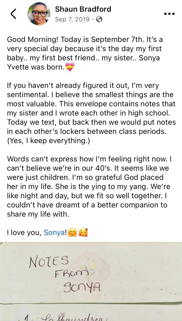 Today’s “Hello Sunday” is dedicated to the first person I ever loved—besides my mother, of course —my sister, Sonya. Today is her 51st birthday!!! We are really grown now!!😄 Here’s what I shared several years ago.