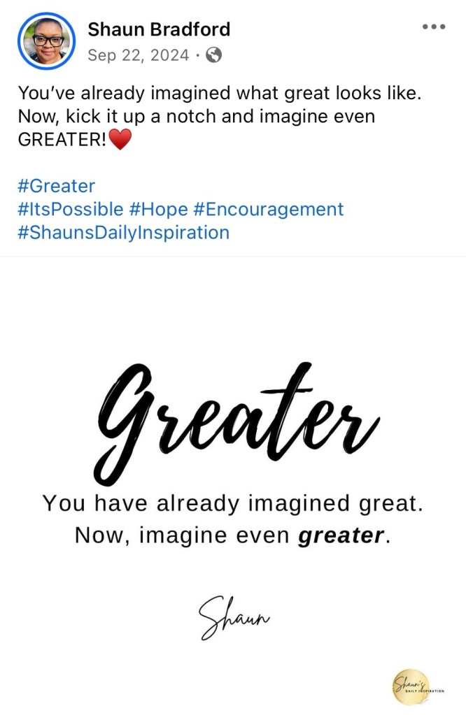 Last year, when I wrote—“Kick it up a notch and imagine even GREATER!”—I’m not going to lie, I couldn’t imagine greater. I couldn’t see beyond what I had already imagined as great. Then, God began to work with me on releasing limits. Whenever I would place a “Shaun” limit on something (things I could possibly achieve on my own), He’d remind me to release that limit. To not even have one. To allow Him to do what He does. Reading Edwina’s book has allowed me to see far beyond what I’ve ever imagined as an adult. However, it’s made my childhood dreams seem within reach. Not only can I see them, I can feel them.