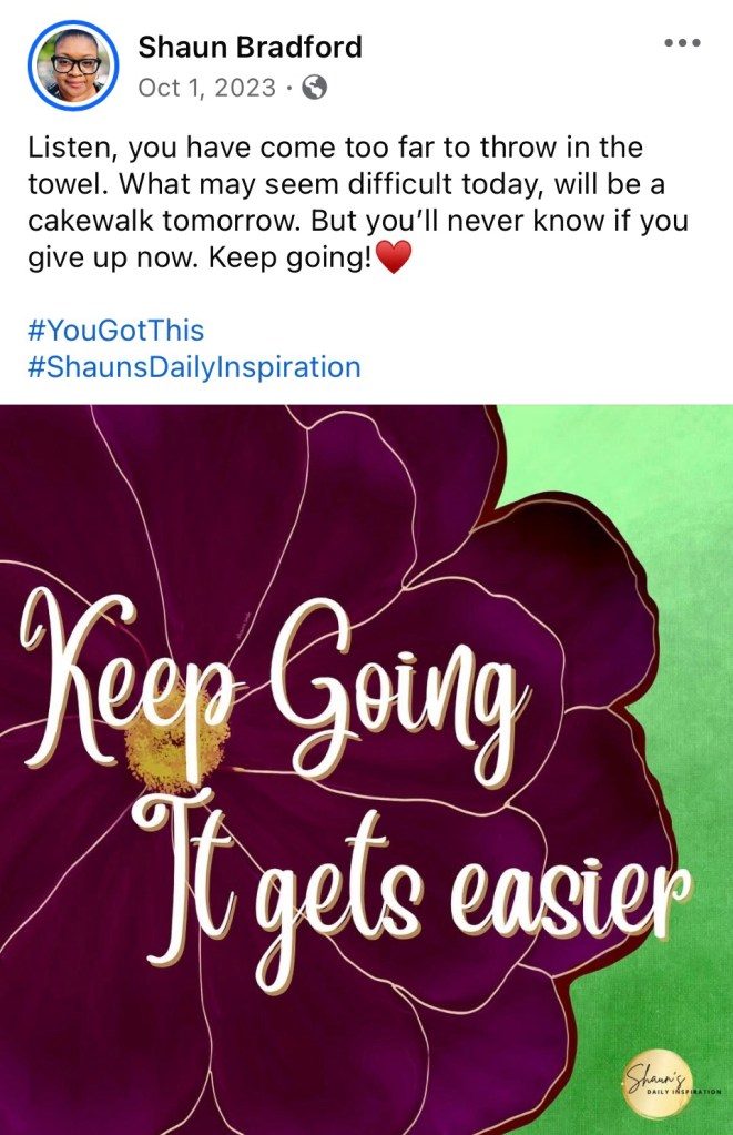 Listen, keep going. You’ve come too far to give up. Life may not become easier, but through difficult experiences, you become stronger and more resilient over time.