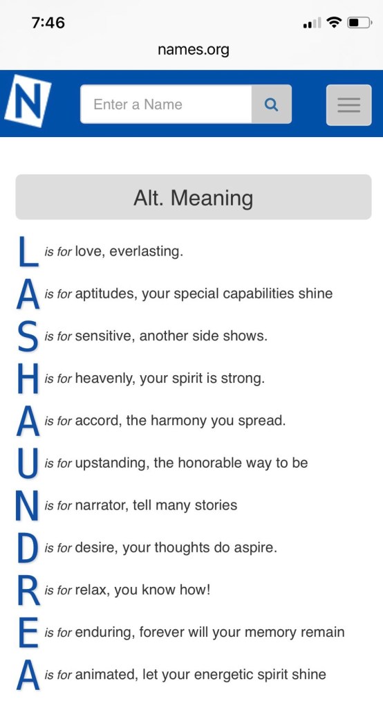 On November 9, 2021, at 7:46 AM, I was looking up the meaning of my name on Names.org. I’m pretty sure I was inspired to do so by someone’s post on social media. Shaking my head, laughing. Oh, the random things I have saved in my photos.