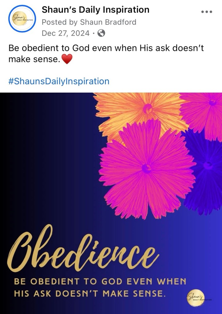 Over the years, I’ve learned that God’s ask won’t always make sense. Sometimes you won’t understand it, nor will those around you. However, be obedient anyway. Obedience is the key to peace and elevation. Trust God.