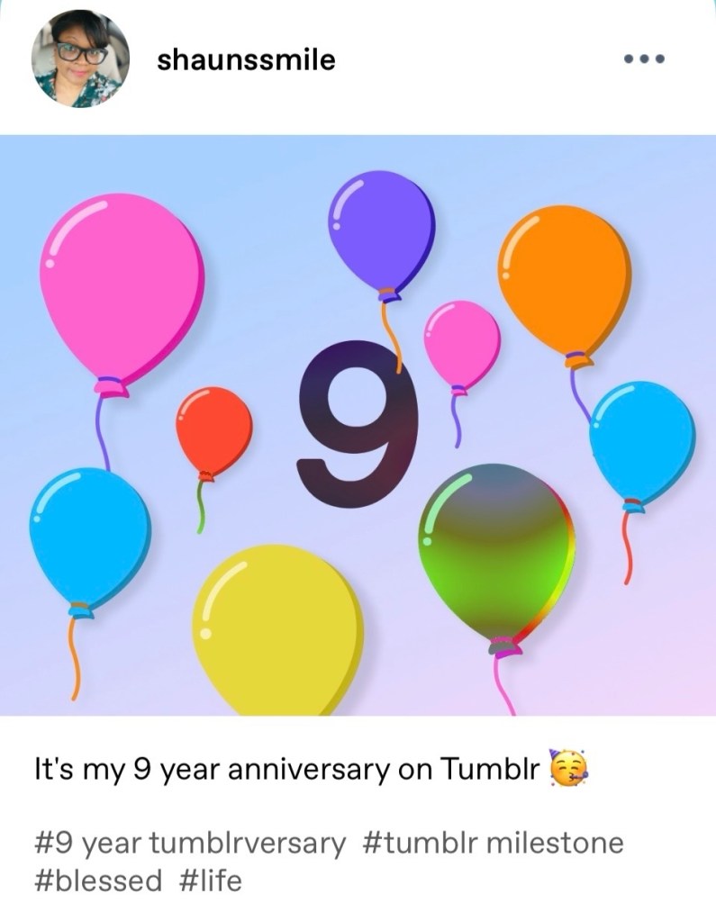 This morning, I was reminded that I had a Tumblr account. I had forgotten all about it until the suggestion to share a post on the site popped up. Well, after I logged in, I had a notification that my ninth Tumblr anniversary was last month. Had no idea! The last time I shared anything on the site was five years ago! Can’t help but wonder if this is my sign to mosey back over to that space for a while. It’s a hodgepodge of random posts. Nothing structured. Free flowing…like me.☺️