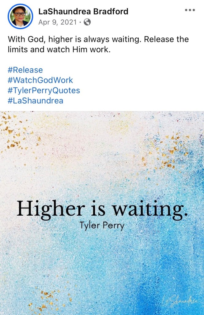 I shared Tyler Perry’s quote after I took my life-changing leap of faith on April 1, 2021. I released the limits, and God did the rest. There’s so much more to come, nationally, then globally. I feel it. I know it. Higher is waiting.♥️