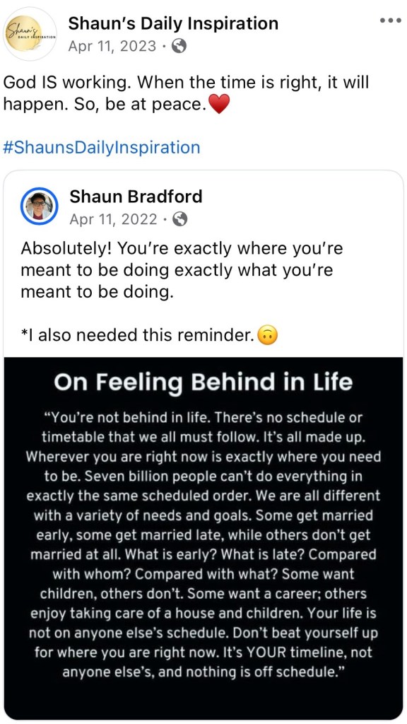 I needed to see all three messages this morning (the two captions and the main message). In 2022 and 2023, I had no idea I would be where I am today. I felt so behind. I felt like things weren’t moving or coming together. But God! Even though I couldn’t see or feel it, He already had things lined up. I was never behind. Everything was happening according to God’s plan, scheduled times, and with my best interests in mind.
