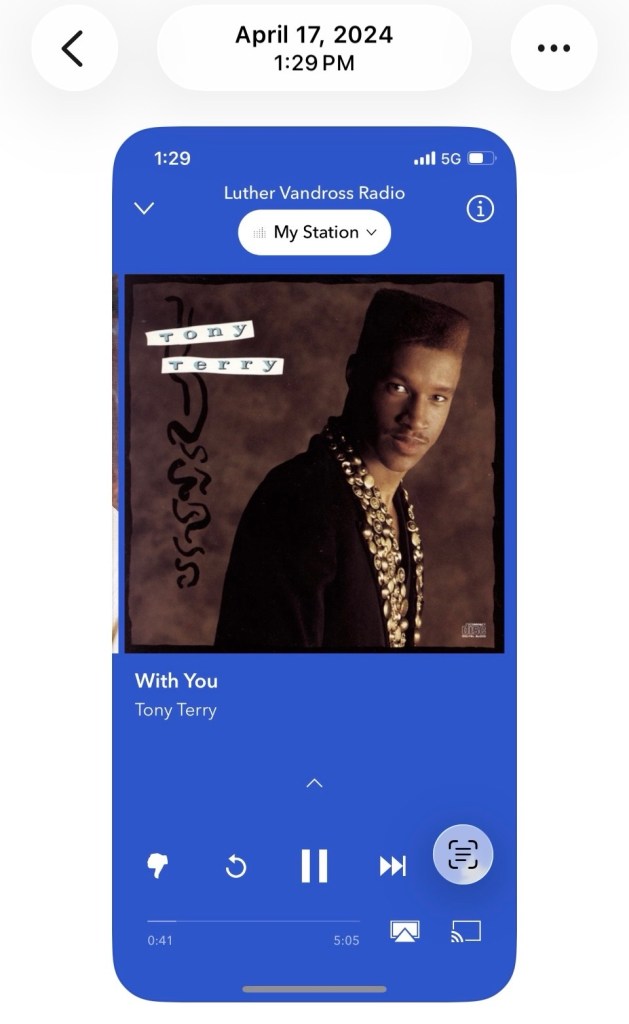 hopeOn April 17, 2024 April 17, 2026 Shaun Bradford On April 17, 2024, I was listening to Tony Terry’s “With You.” Do you know what you were listening to on this day two years ago?♥️ ~Shaun Tony Terry – “With You” Share this: Share on X (Opens in new window) X Share on Facebook (Opens in new window) Facebook Like Loading... Published by Shaun Bradford My life is full of adventures— good and bad, and I’m living in every moment. Can’t help but be present. View all posts by Shaun Bradford