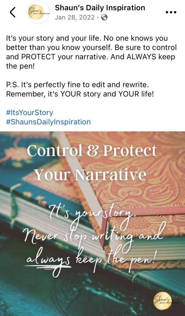 I shared this message four years ago, and it remains just as relevant today. We only have one life and must control and protect our stories.