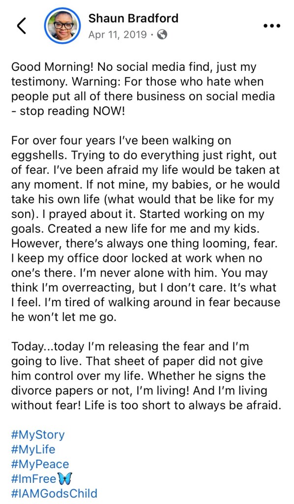 When someone tells you they are afraid, believe them. I don’t care how nice or good you may believe someone to be, believe the person who is afraid. They’re not overreacting. My ex did not want to let me go. We had been separated and going through the divorce process for over four years and he was still texting me saying I would always be his wife (kept the communication open because my son was still a minor). It was a very scary situation to be in. Again, I am so grateful I am still here. I’m so grateful I’ve been able to watch my babies become thriving adults. Y’all, I do not take my life for granted at all.