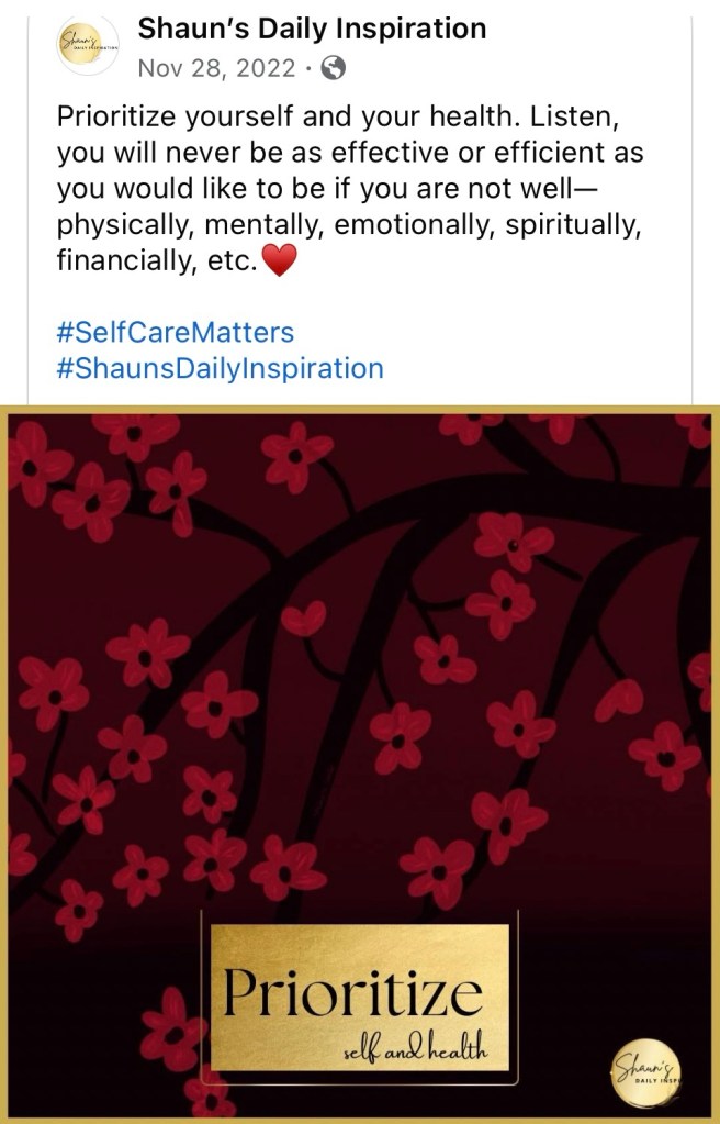 I know it’s Thanksgiving and most aren’t thinking about health or healthy anything; however, your health still matters. Not only am I speaking about physical health, but mental and emotional health as well. Be mindful of what you put in your body (enjoy, but eat in moderation) and who you allow in your space (separate yourself from people and things that causes you stress). Prioritizing your health is of utmost importance.