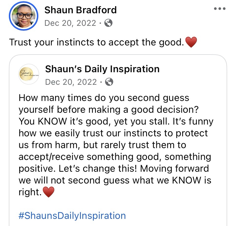 As I suggested two years ago, we trust our instincts to protect us from harm but rarely use them to guide us toward good things. How about we consider reconditioning our mindset to expect good things to happen instead of bad or expecting the best of people instead of the worst?