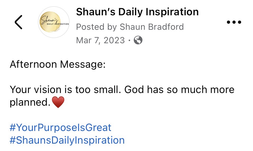 Two years ago, I shared a random afternoon message. Didn’t even create or include an image, so I know it must have been one of those messages I felt compelled to share. This morning I am sharing it for the same reason. It’s important that you know your vision is too small. God has so much more planned for you.