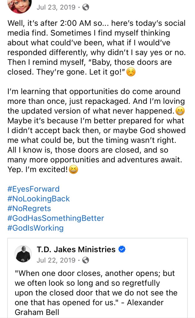 On July 23, 2019, I wrote the following (shared the entire post in the screenshot below), “I’m learning that opportunities do come around more than once, just repackaged.” Well, this is absolutely true. As with issues we don’t properly handle—you know the ones that keep resurfacing in different ways—opportunities do come back around, often in a different form. Well… sometimes we actually get the same exact opportunity—not repackaged in a different way, but exactly the same.