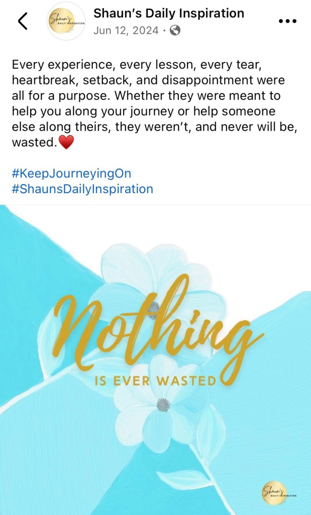 Since turning 50, I have experienced quite a few full-circle moments, many of which I didn’t see coming. Today, I had another one of those moments. The Facebook post I shared three years ago is still true—what you’ve gone through or are currently going through is preparing you for where you’re headed. Hang in there. Trust God, His process, and His plan. Stay open to opportunities that resurface. They are not all negative. I’m finding most are opportunities to do things better or move us towards our goals and dreams.