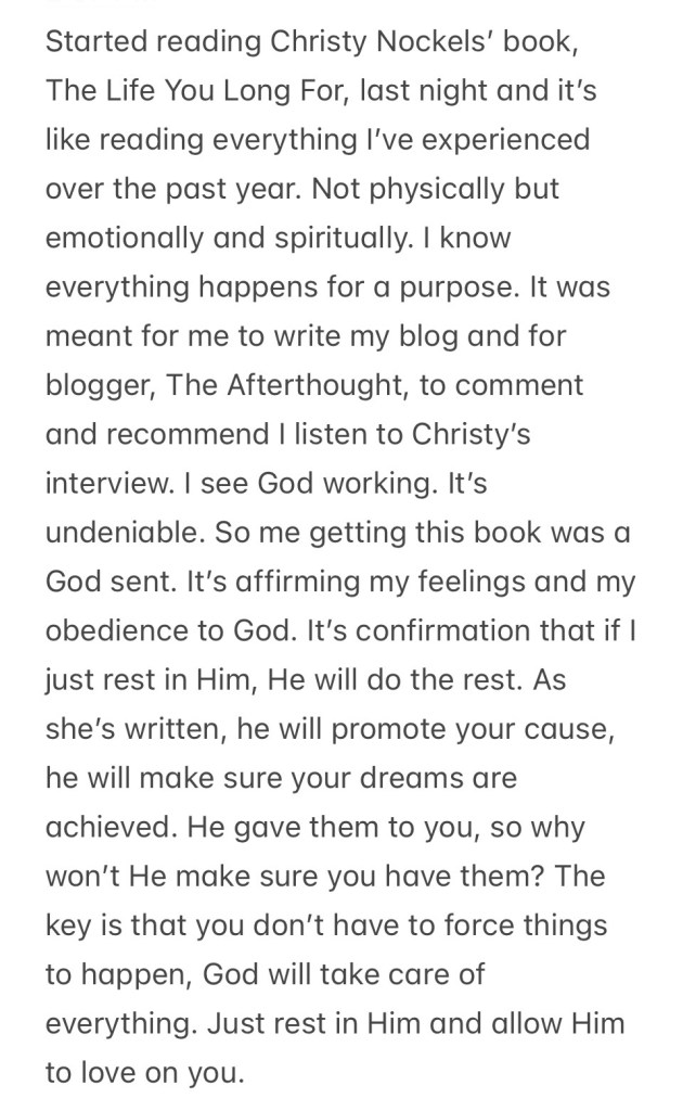 About a week ago, I was led to re-read Christy Nockels’ “The Life You Long For …”. I needed to find my way back to the peace and rest I had found. I now realize I must work daily to maintain it. It’s not something that will always come easy, especially when I encounter new challenges. From here on, I must be intentional about making necessary adjustments before my peace is completely disturbed. It’s just too costly to wait.