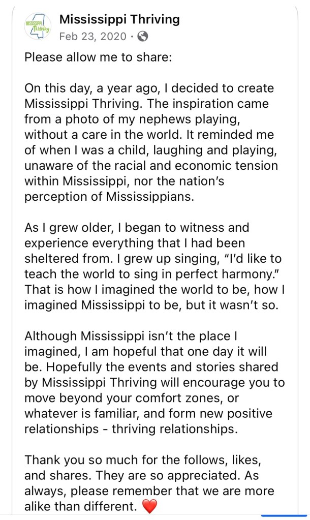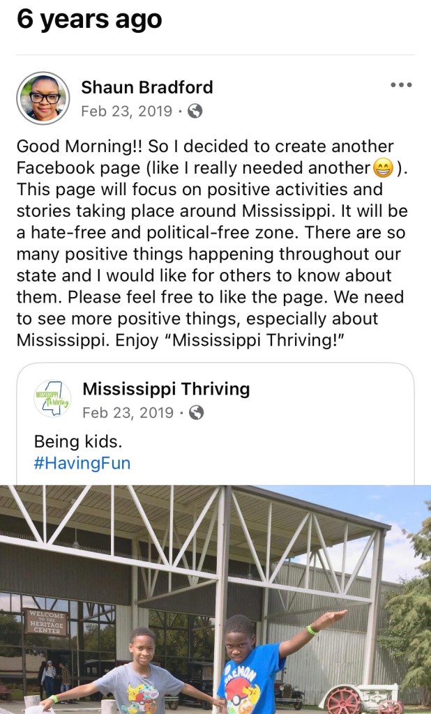 I hadn’t looked at all of my Facebook memories until moments ago. Six years ago, I created my social media platform, “Mississippi Thriving.” I posted my official welcome message in December of that year, so you may see me celebrate milestones in February and December.