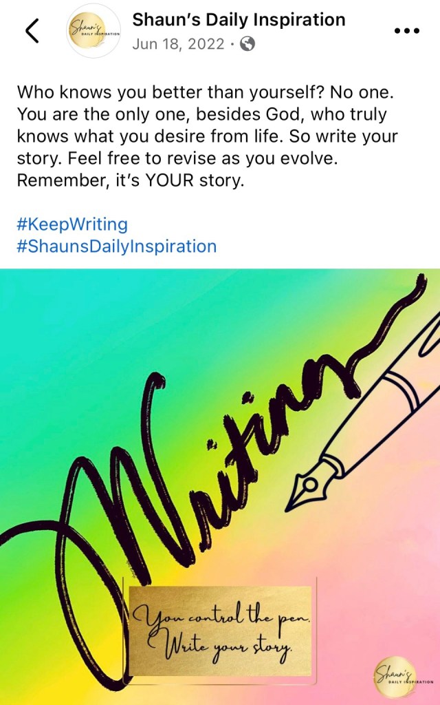 Besides God, who knows you better than YOU? The answer is “No one.” Always remember, you control the pen to your life’s story. As you evolve, your story evolves. Feel free to revise it as you grow—it’s YOUR story.